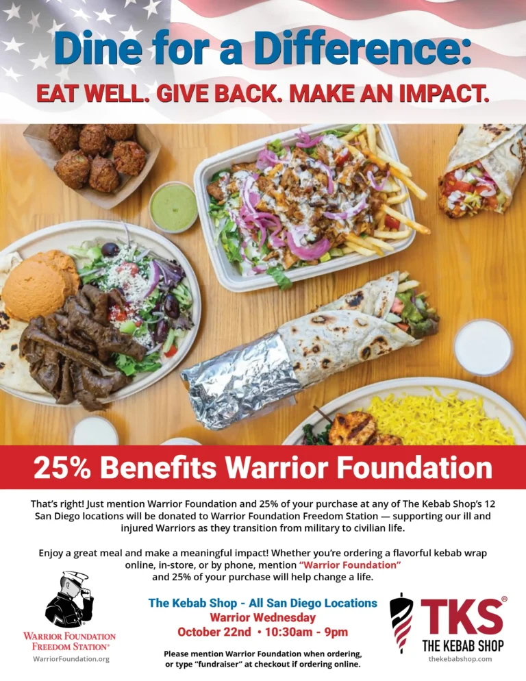 That’s right! Just mention Warrior Foundation and 25% of your purchase at any of The Kebab Shop’s 12 San Diego locations will be donated to Warrior Foundation Freedom Station — supporting our ill and injured Warriors as they transition from military to civilian life. Enjoy a great meal and make a meaningful impact!